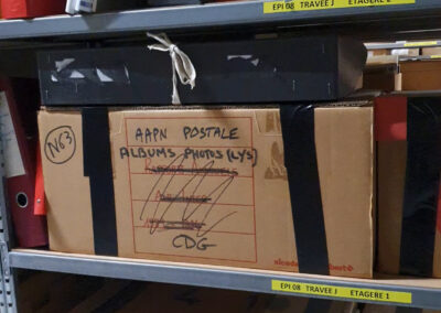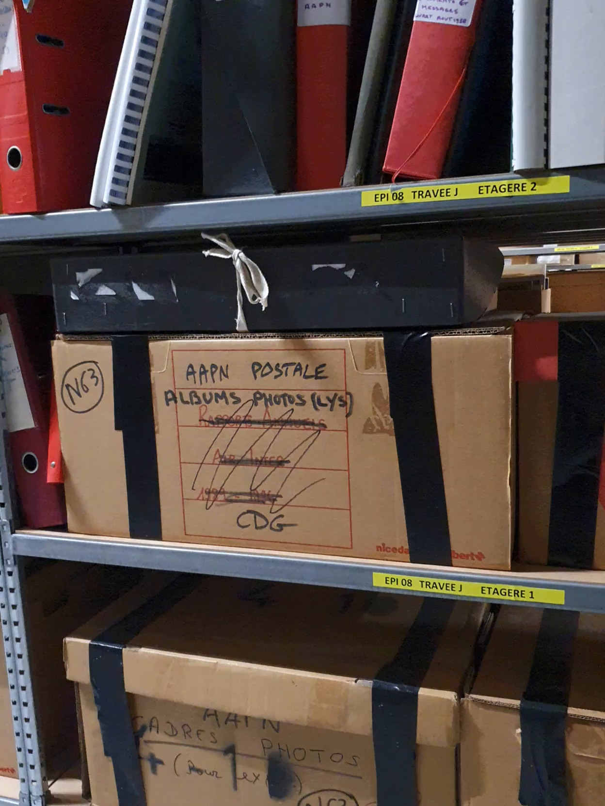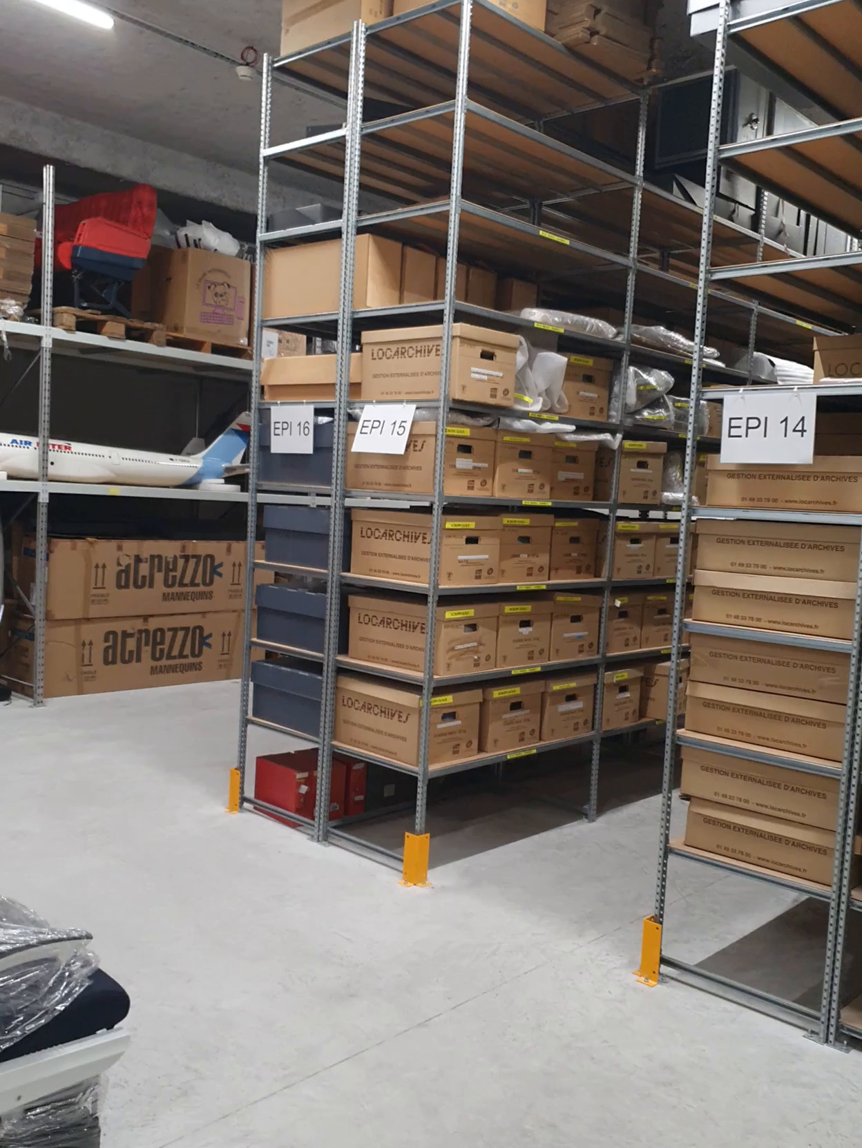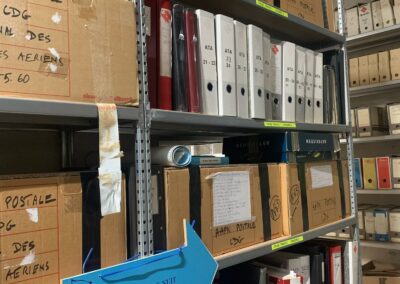 Des cartons remplis de documents sur six niveaux d’étagères. Documents triés ou en cours de tri. Allez savoir !
