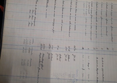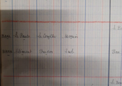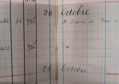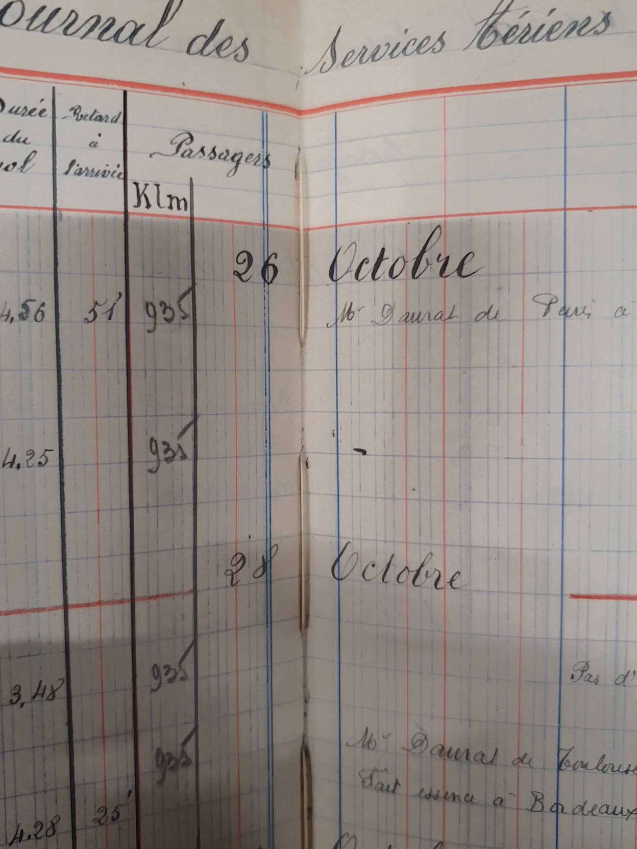 De l’un d’entre eux, j’extrais le premier « journal des mouvements aériens » sur lequel figurent tous les mouvements de l’année 1945 et suivantes, avec les noms des équipages, les parcours, les temps de vol, etc… et les éventuels passagers embarqués (Daurat notamment). Nous restons devant ce journal un certain temps, à le feuilleter et à le commenter…