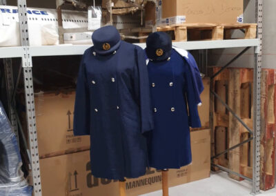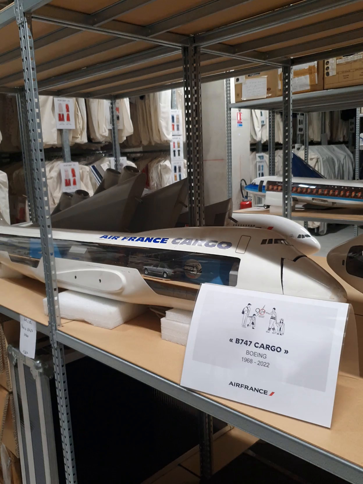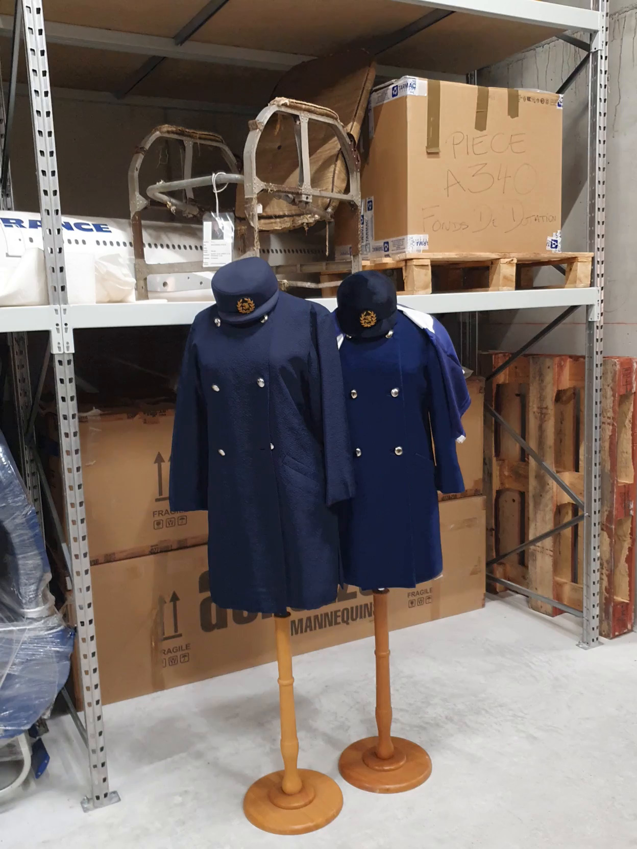 Je cite : un siège en cuir marron, rescapé d’un Latécoère 631 D’autres sièges illustrant toutes les époques de la compagnie, plein de sièges ! Des housses d’uniformes des mêmes époques ! Plein de housses !